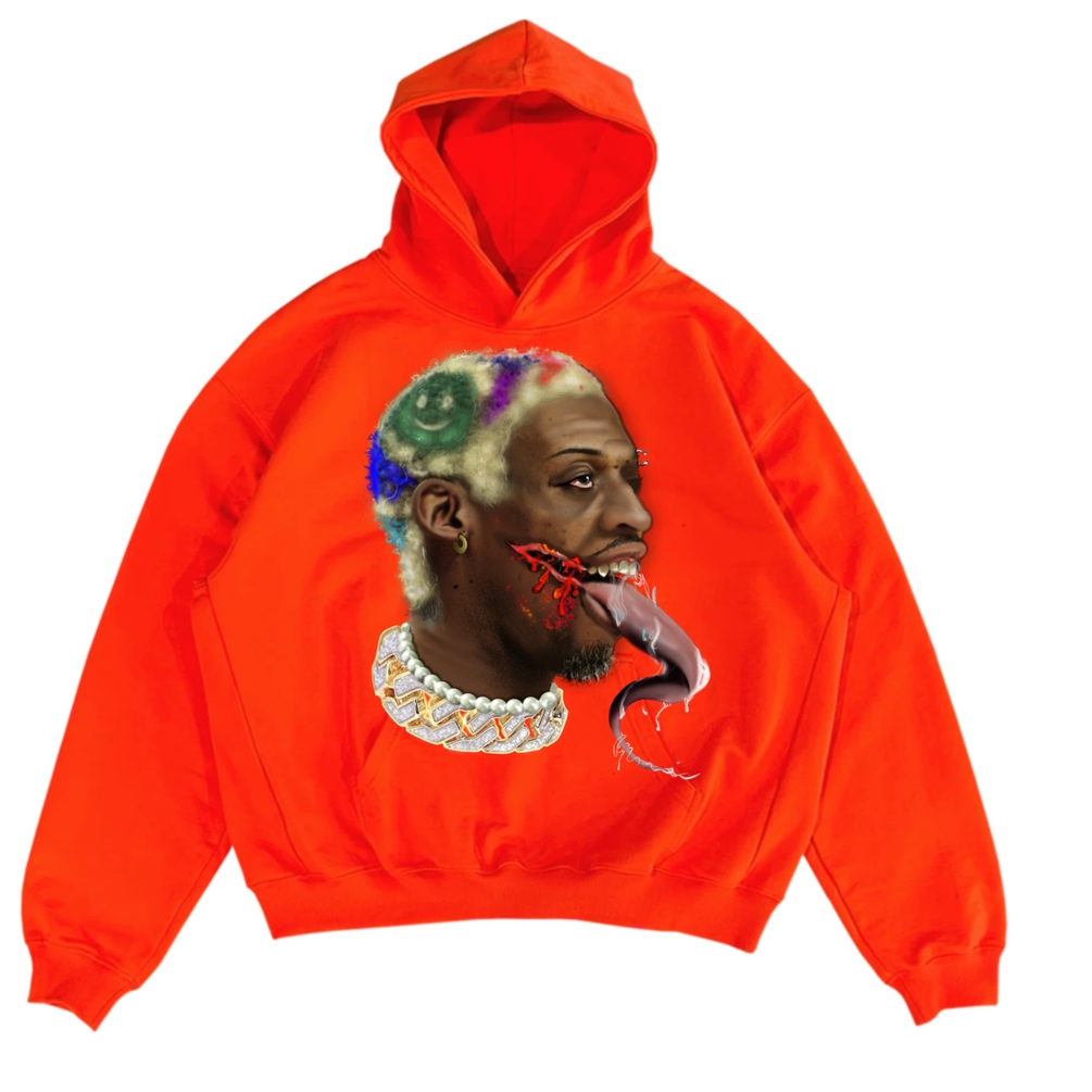 Dennis Rodman represented and modified on this high quality hooded shirt. 36oz 100% COTTON 465GSM FRENCH TERRY 2.2LBS TOTAL AVG WEIGHT DROPPED SHOULDERS BOXY CUT SLIGHTLY CROPPED LENGTH OVERSIZED ARMHOLE TRUE TO SIZE
